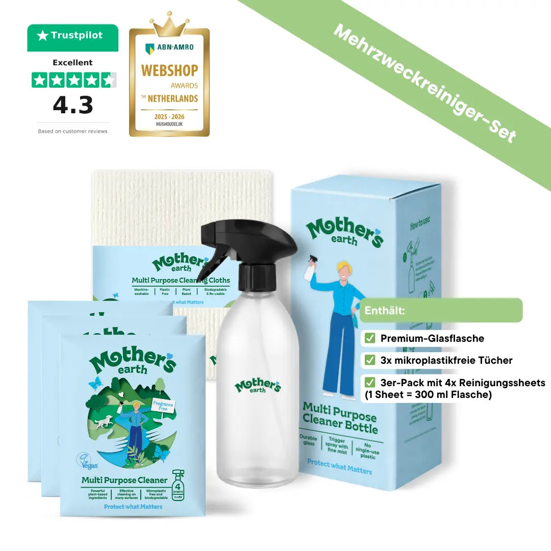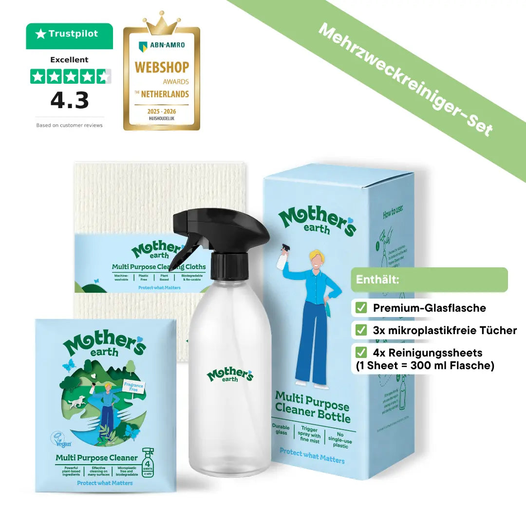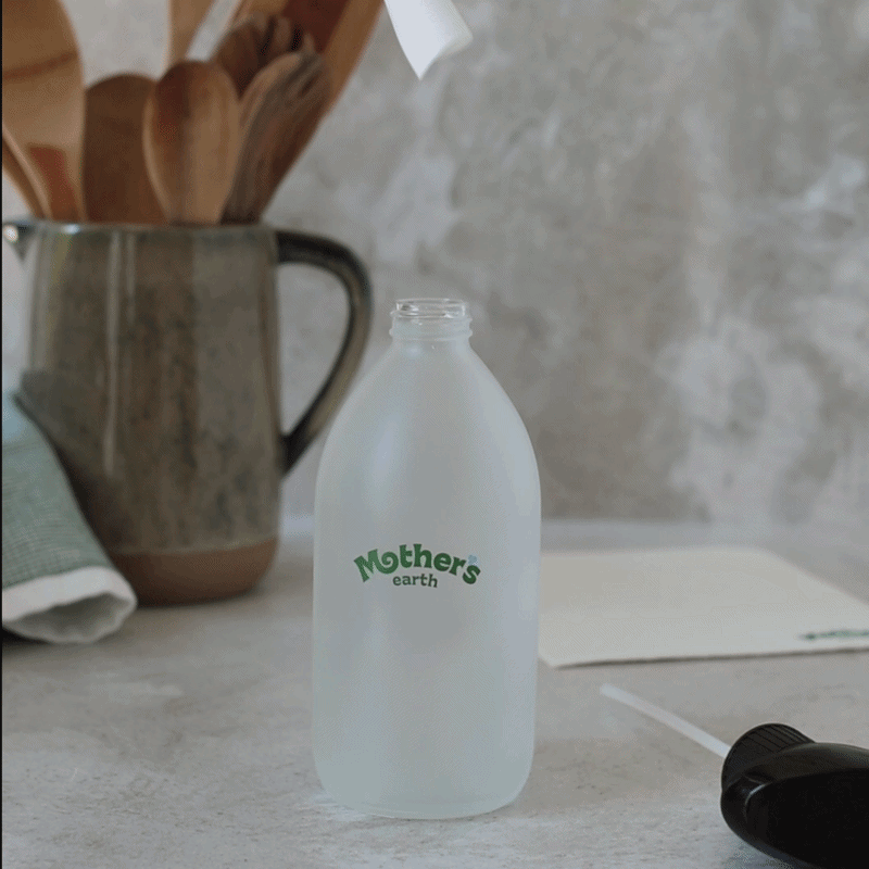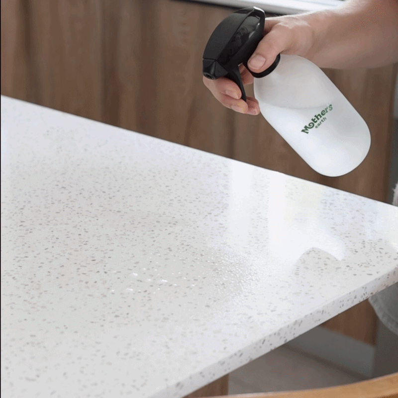 Direkt auf die Oberfläche sprühen (z.B. Tisch) oder auf das Mother’s Earth Tuch sprühen und sauber wischen. Funktioniert auf Glas, Holz, Keramik, Stein und mehr.