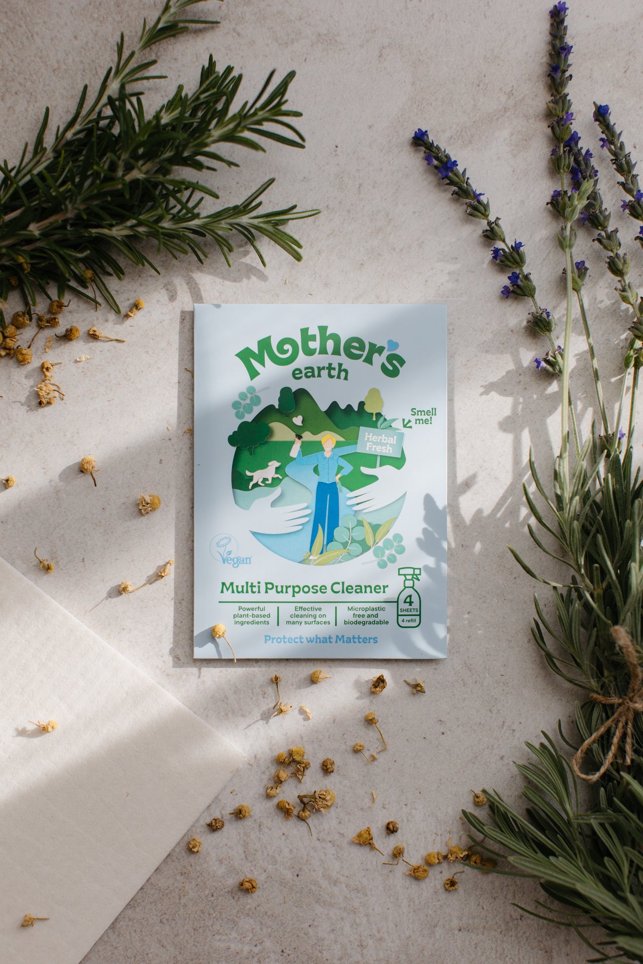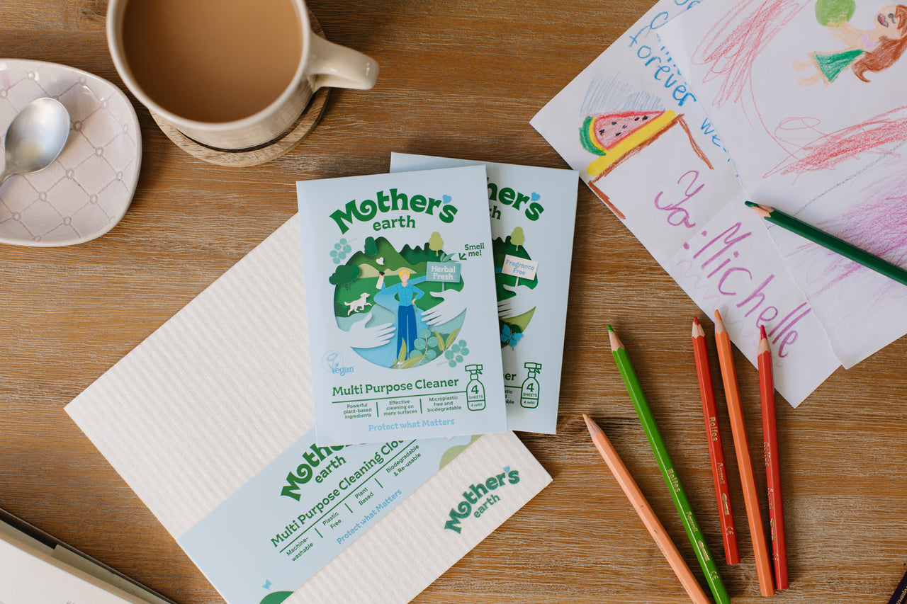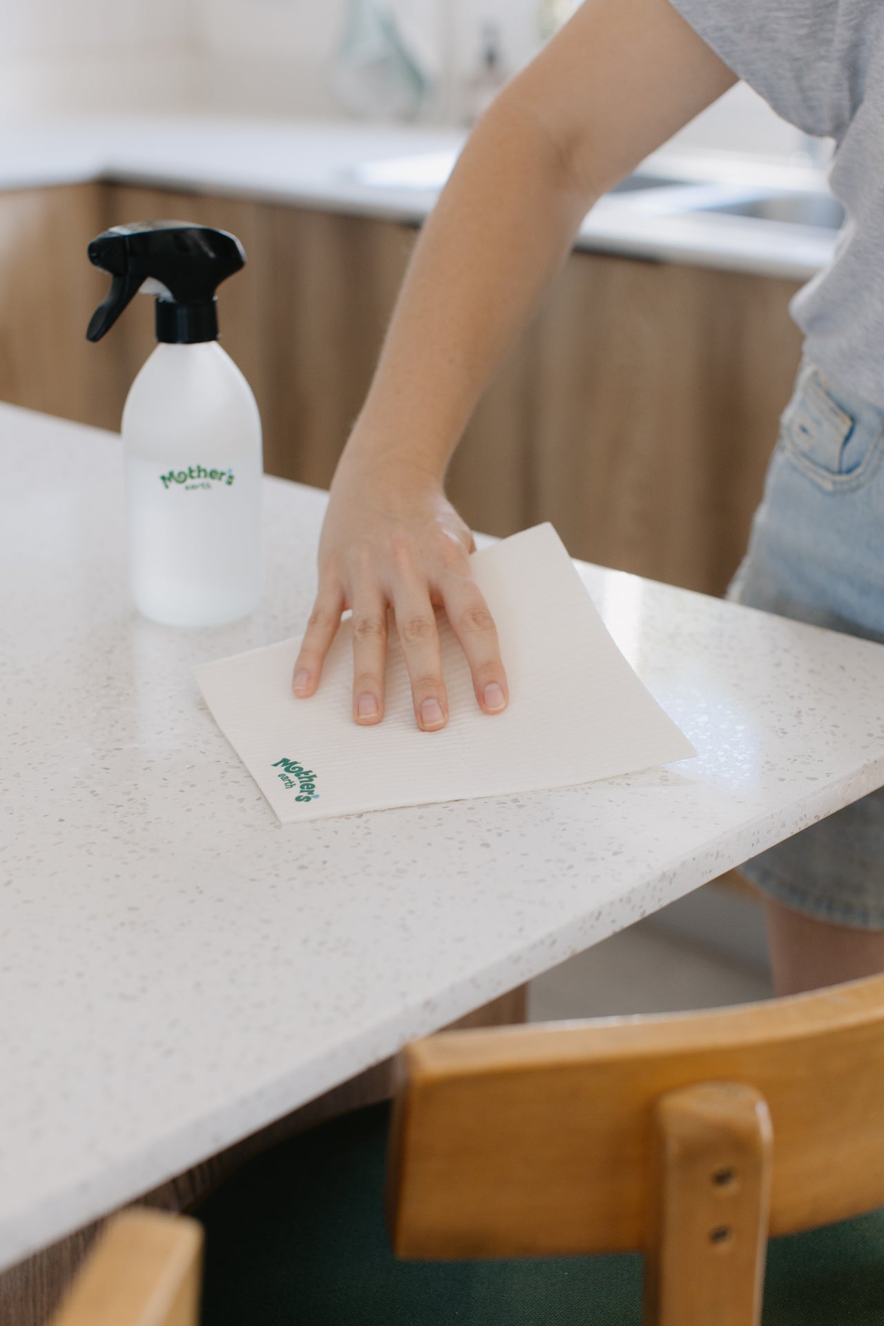 Direkt auf die Oberfläche sprühen (z.B. Tisch) oder auf das Mother’s Earth Tuch sprühen und sauber wischen. Funktioniert auf Glas, Holz, Keramik, Stein und mehr.