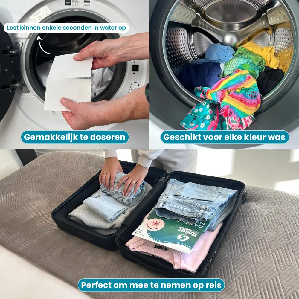 Absoluut! Onze wasstrips zijn speciaal ontworpen om volledig op te lossen in water, zodat er geen resten achterblijven op je kleding of in je machine.